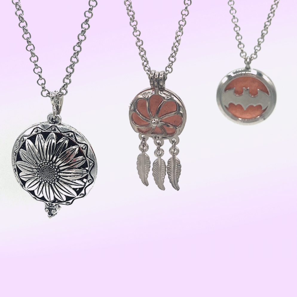 These wearable necklaces hold a felt pad on which you can put a few drops of your favorite scent. Made from mixed zinc alloy with attractive designs!